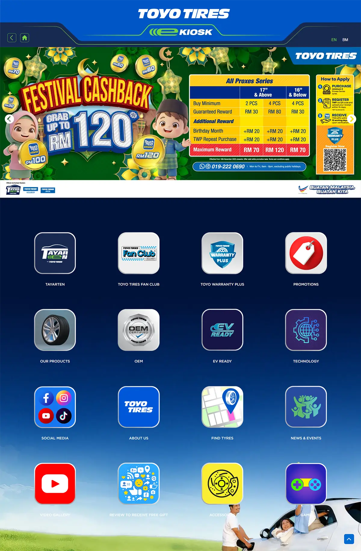 This website is designed as an interactive digital kiosk for Toyo Tires, providing users with quick access to promotions, product information, brand services, technology highlights, warranty details, social media, and dealer-related tools in one user-friendly platform.